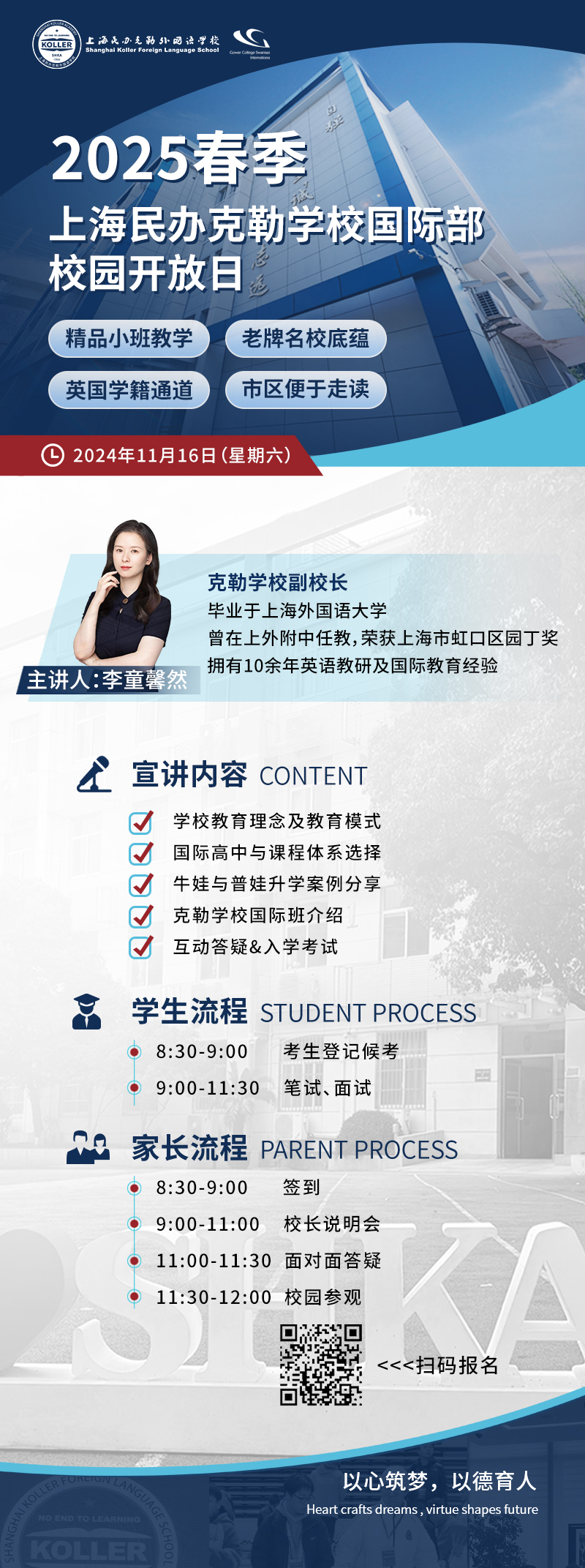 上海克勒学校国际部校园开放日将于2024年11月16日(周六)举行,我们诚邀您来到克勒校园,感受这片小而精致的学术绿洲。