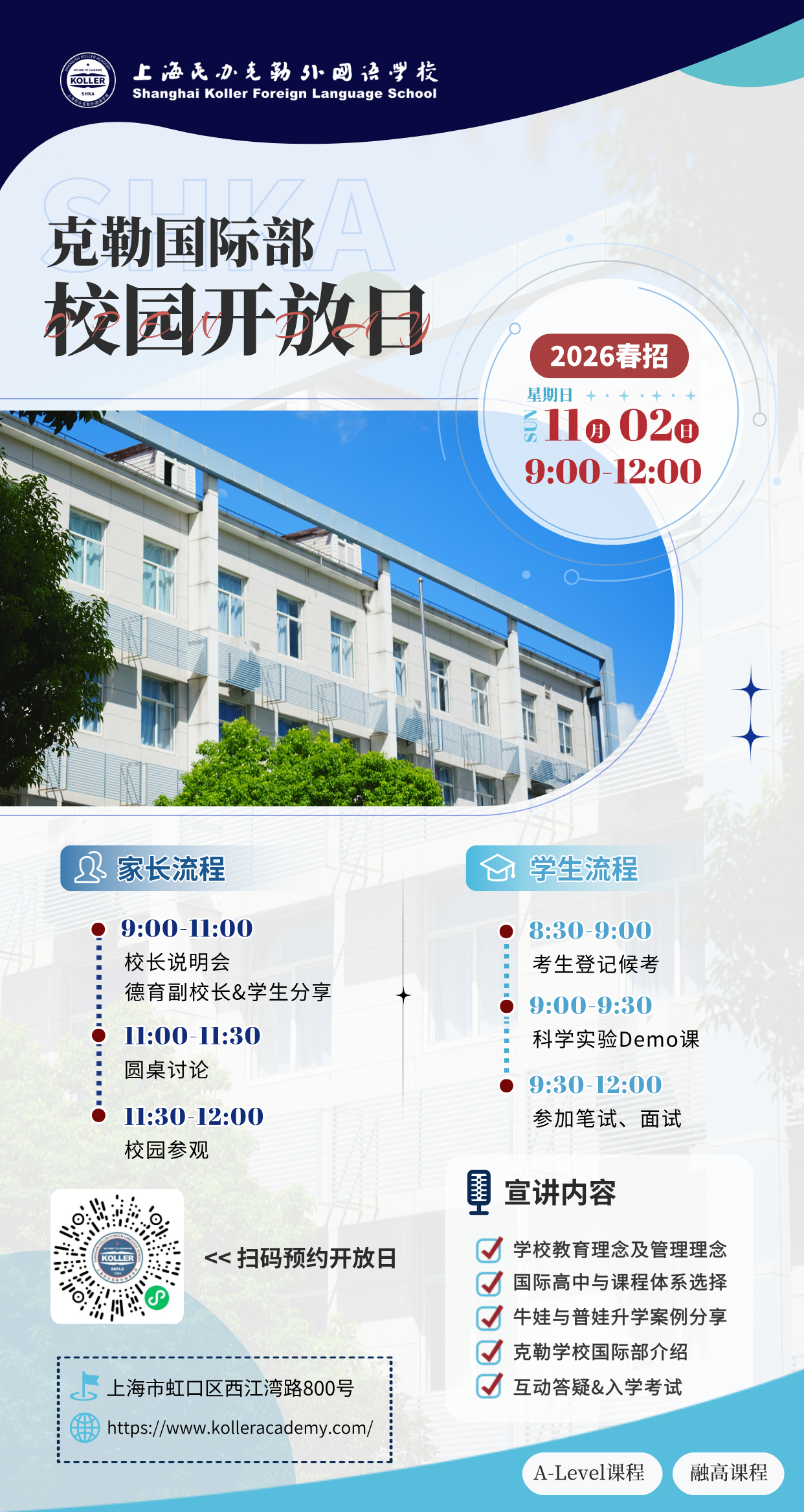 上海民办克勒外国语学校2026年春季学期校园开放日将于2025年11月02日(周日)9:00举行,我们诚邀您来到克勒校园,感受这片小而精致的学术绿洲。