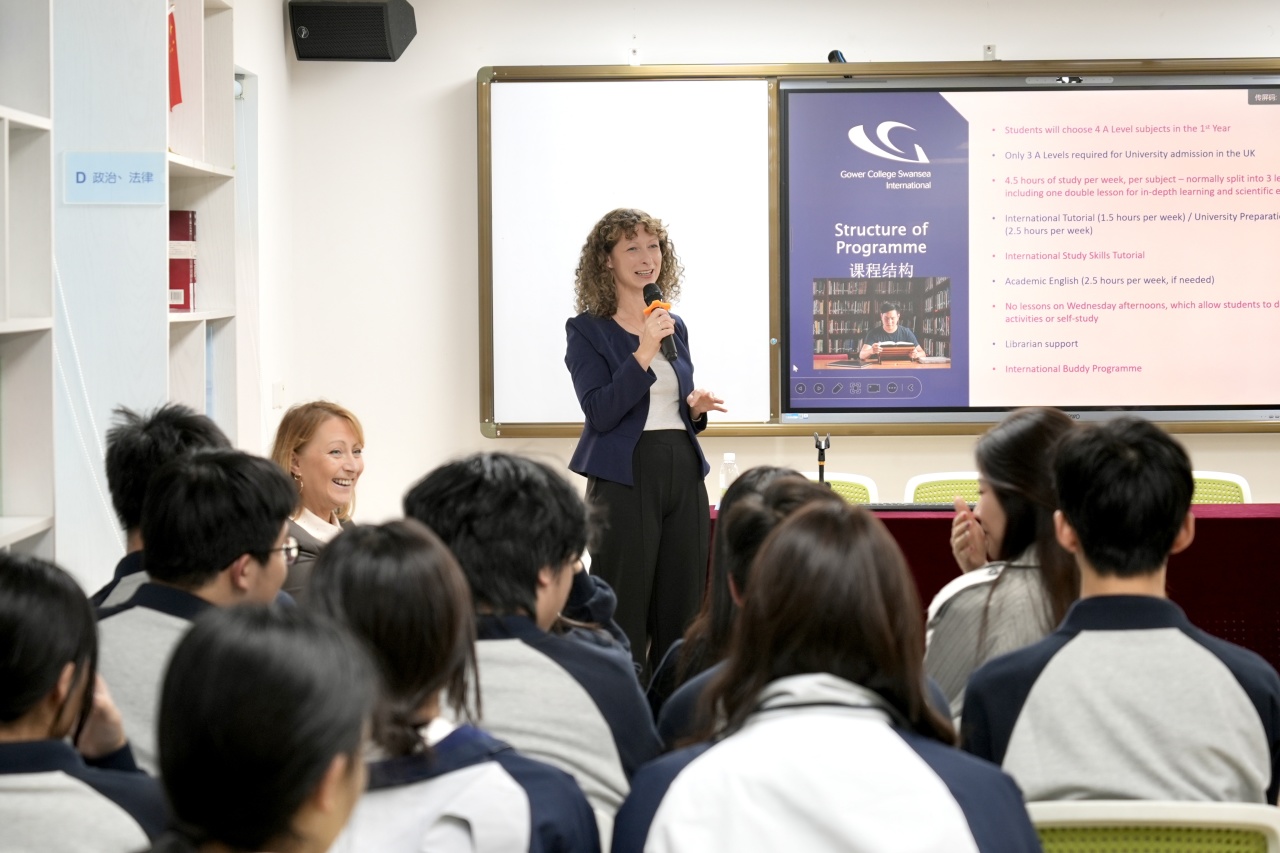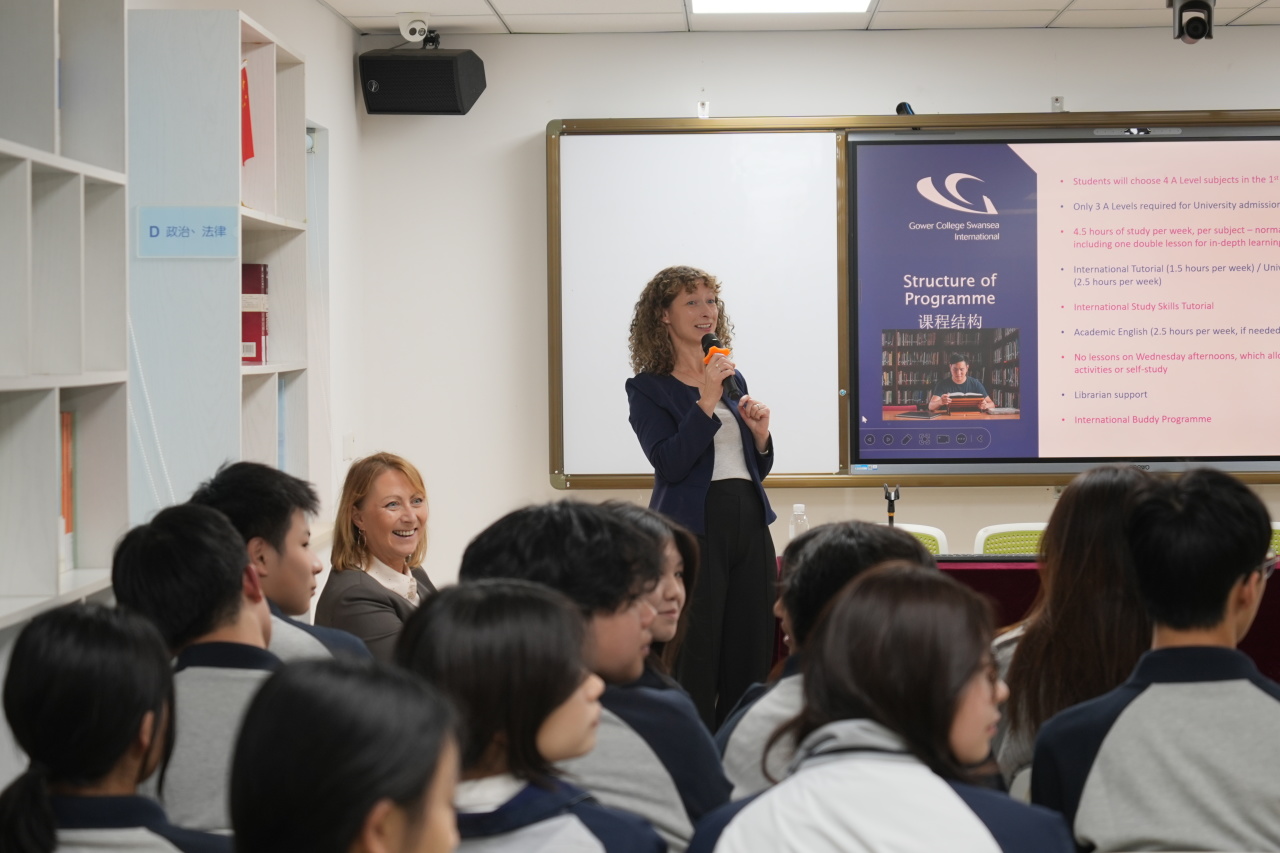 英国高尔中学国际办公室主任Ruth Lewis女士分享了高尔中学的最新办学情况。目前高尔中学拥有近2000名A-Level学生,开设40余门课程,出分率与升学率长期稳居威尔士地区前列,为学生升学提供坚实保障。