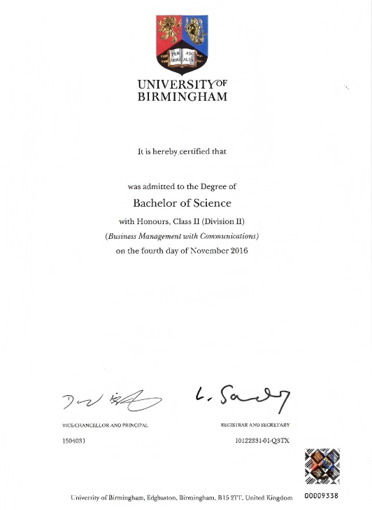 本科文凭证书 (以伯明翰大学为例)