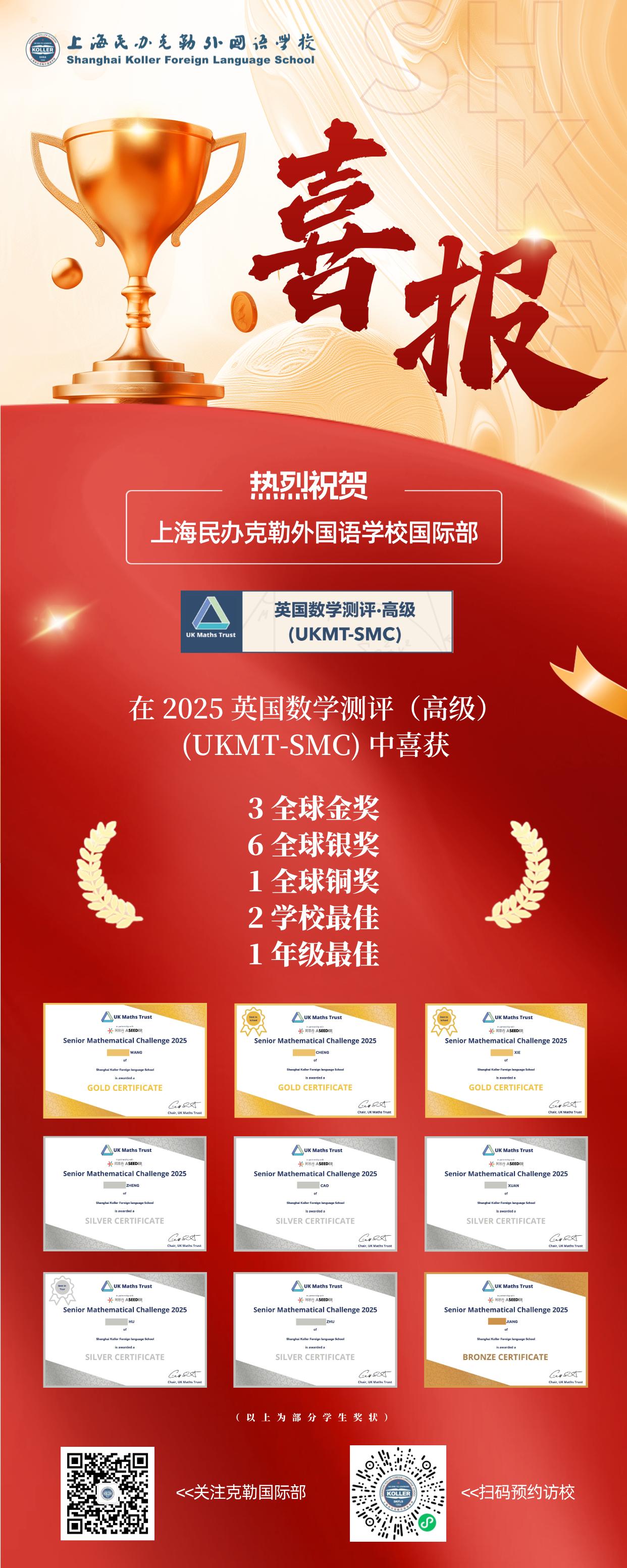 在2025年英国数学测评高级(UKMT-SMC)比赛中,克勒国际部学子们展现了卓越的学术能力和数学水平,从众多参赛者中脱颖而出,取得了?全球金奖*3、?全球银奖*6、?全球铜奖*1、?学校最佳荣誉奖*2、?年级最佳荣誉奖*1等奖项!