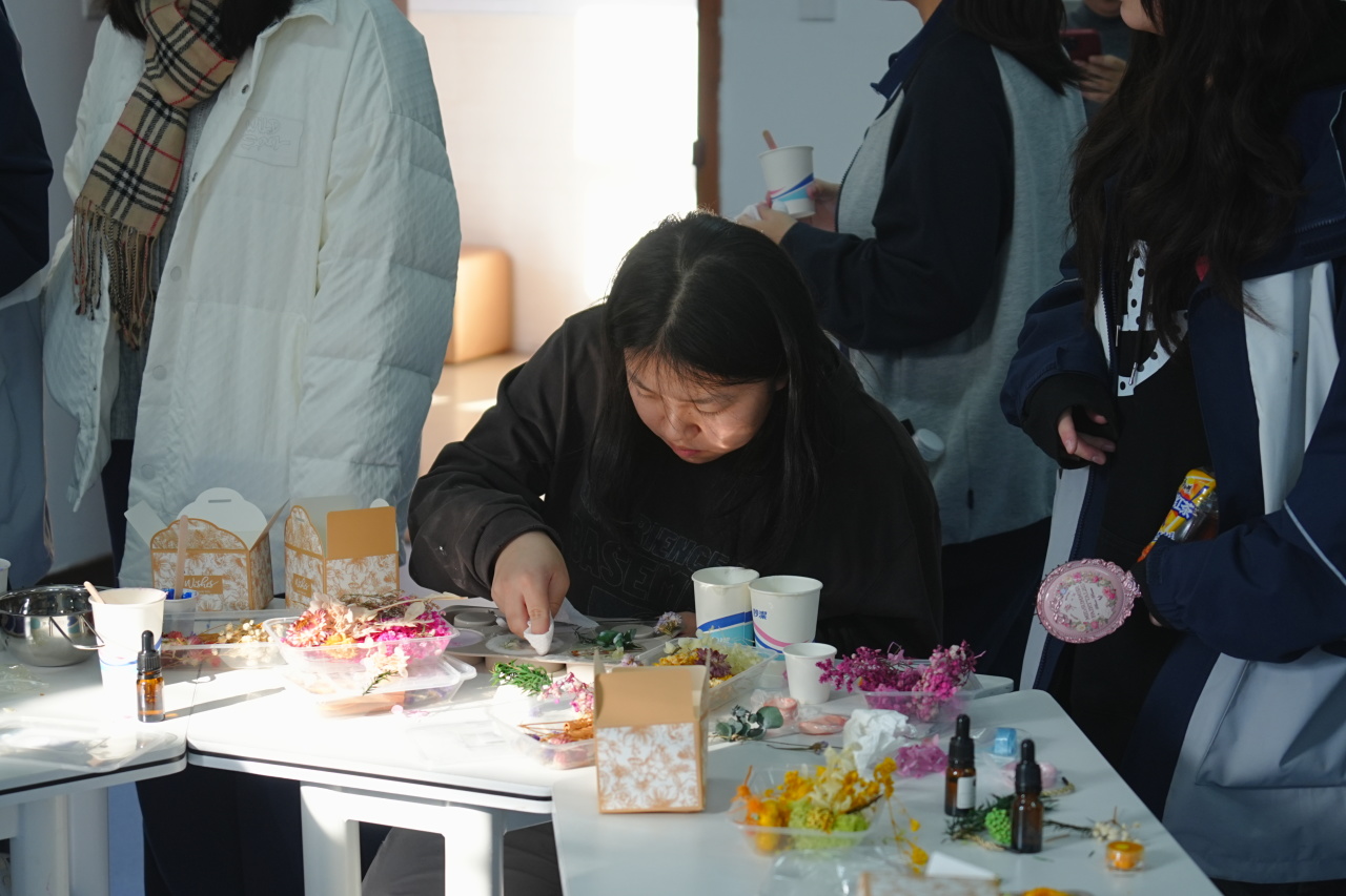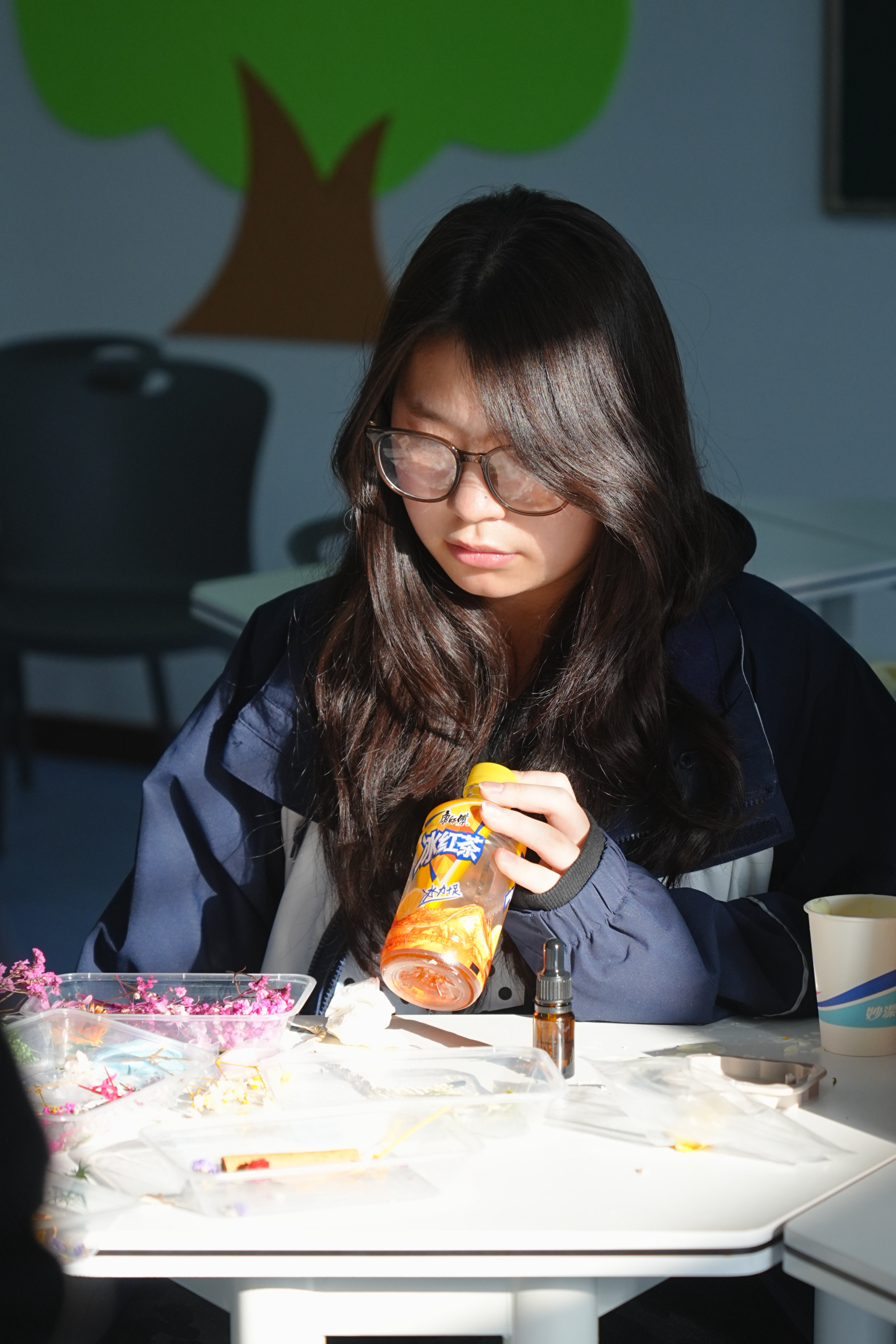 作为本次活动最具创意的融合环节,香薰蜡烛工作坊吸引了众多同学驻足。在动手调制专属香味、选择容器与装饰物的同时,学生们还需用英语介绍自己的设计理念。在这里,语言不再只是工具,而是承载情感与审美的桥梁。