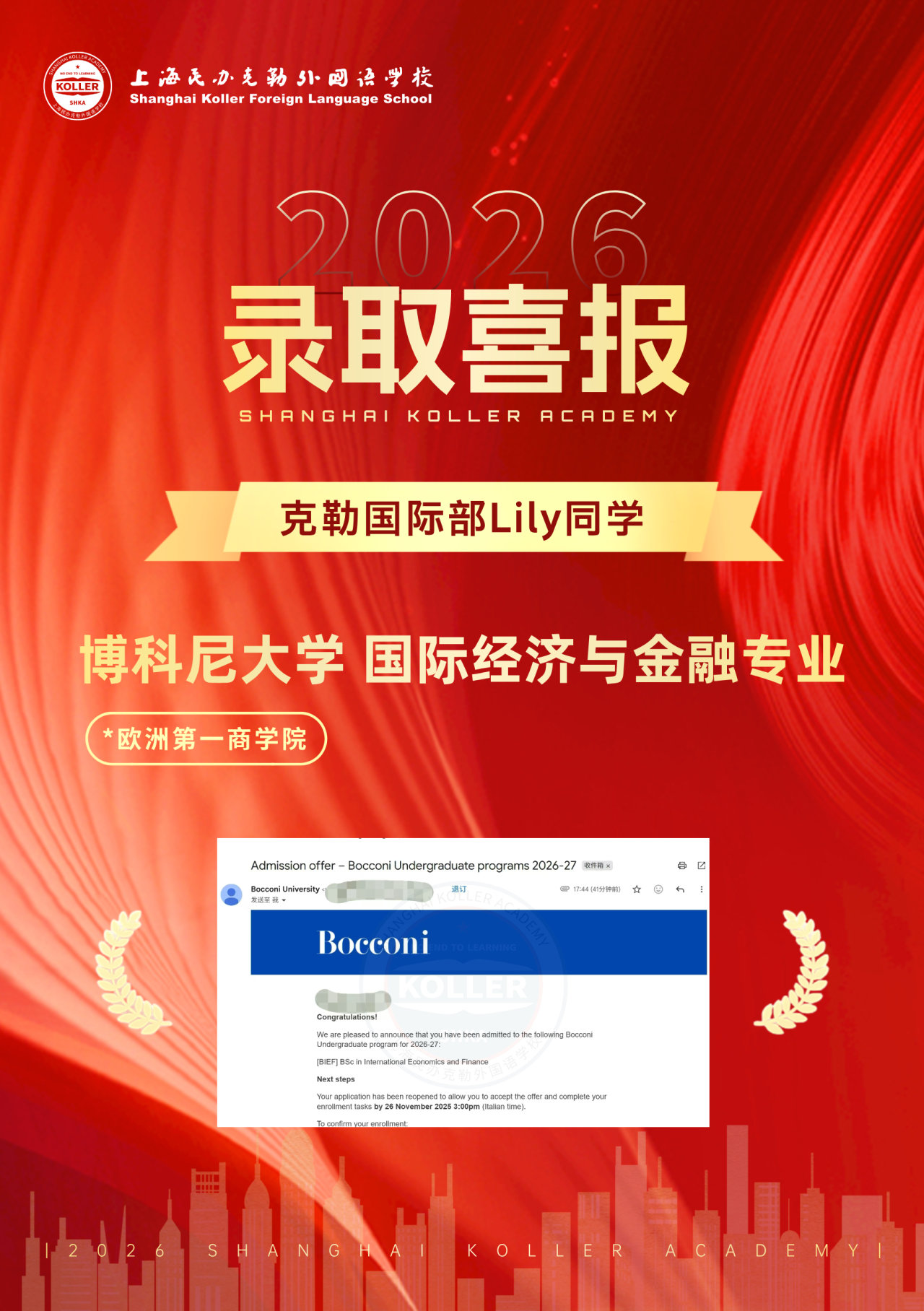 窗外的树叶带着秋末的余色,阳光透过树荫撒在身上,衬得Lily格外耀眼。手握Bocconi(欧洲第一商学院)经济与金融BIEF专业、Bocconi与HEC双学位Data Society and Organization专业两枚Offer,在旁人还在准备笔面试和大考之际,她的申请季已经完美收官。