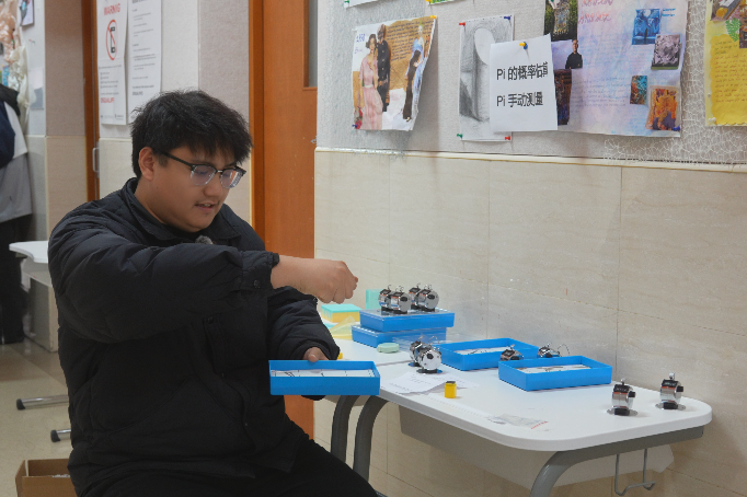 借鉴了经典的“蒲丰投针实验”,用大头针随机投掷在画有平行线的纸上,通过统计相交次数与总投掷次数,一步步推算出π的近似值,真切体会到“随机现象背后藏着必然规律”的数学奥秘,也感受到了大数定律的神奇力量。