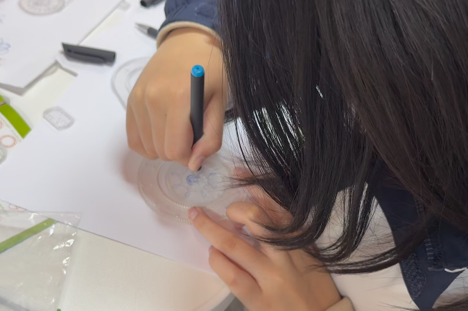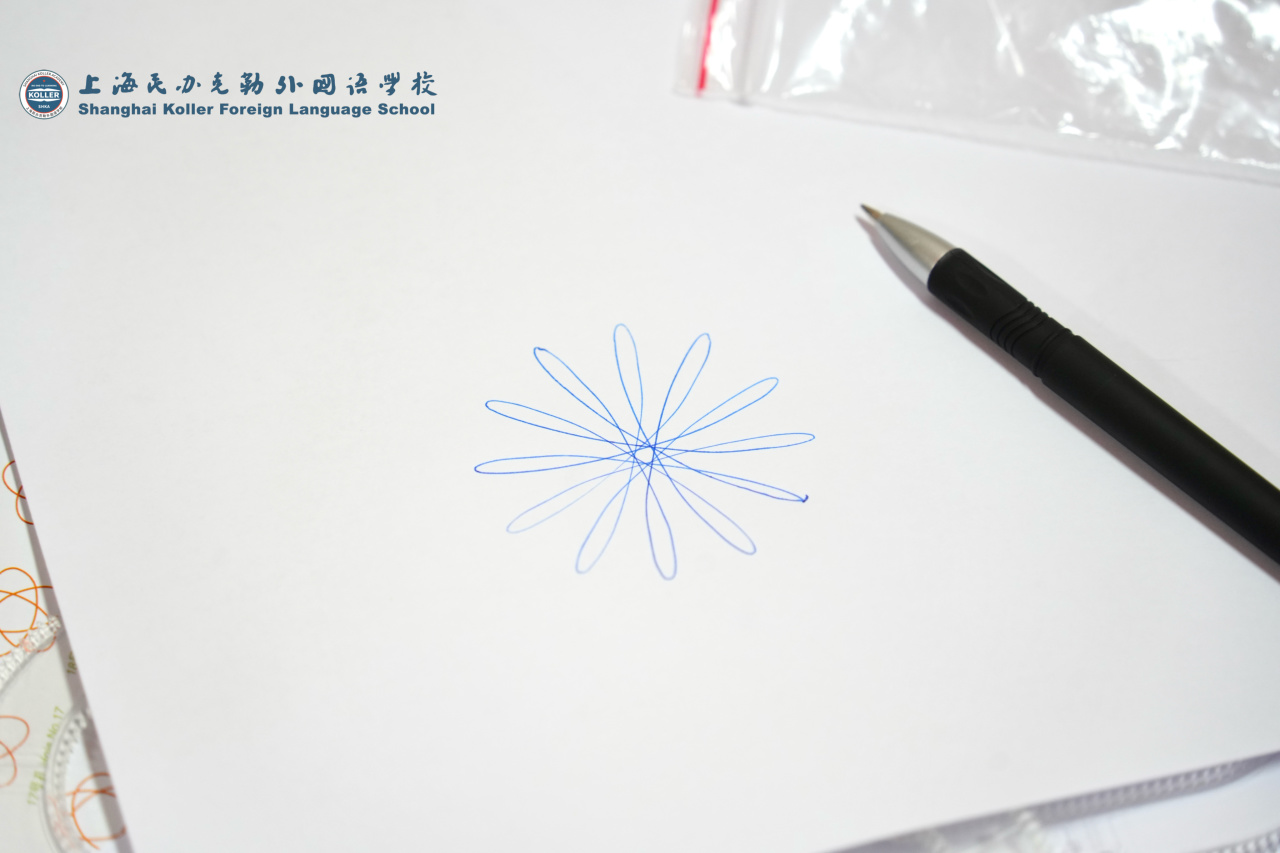 旋转线绘图活动中,同学们在圆尺的帮助下画出一个个漂亮的图形,在动手操作中感受数字与几何的巧妙结合。