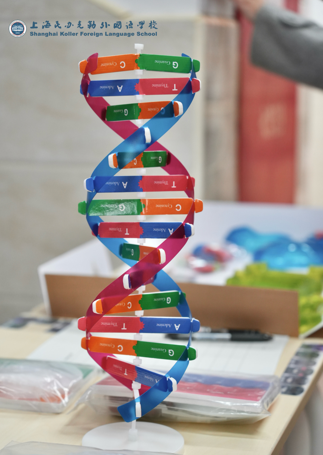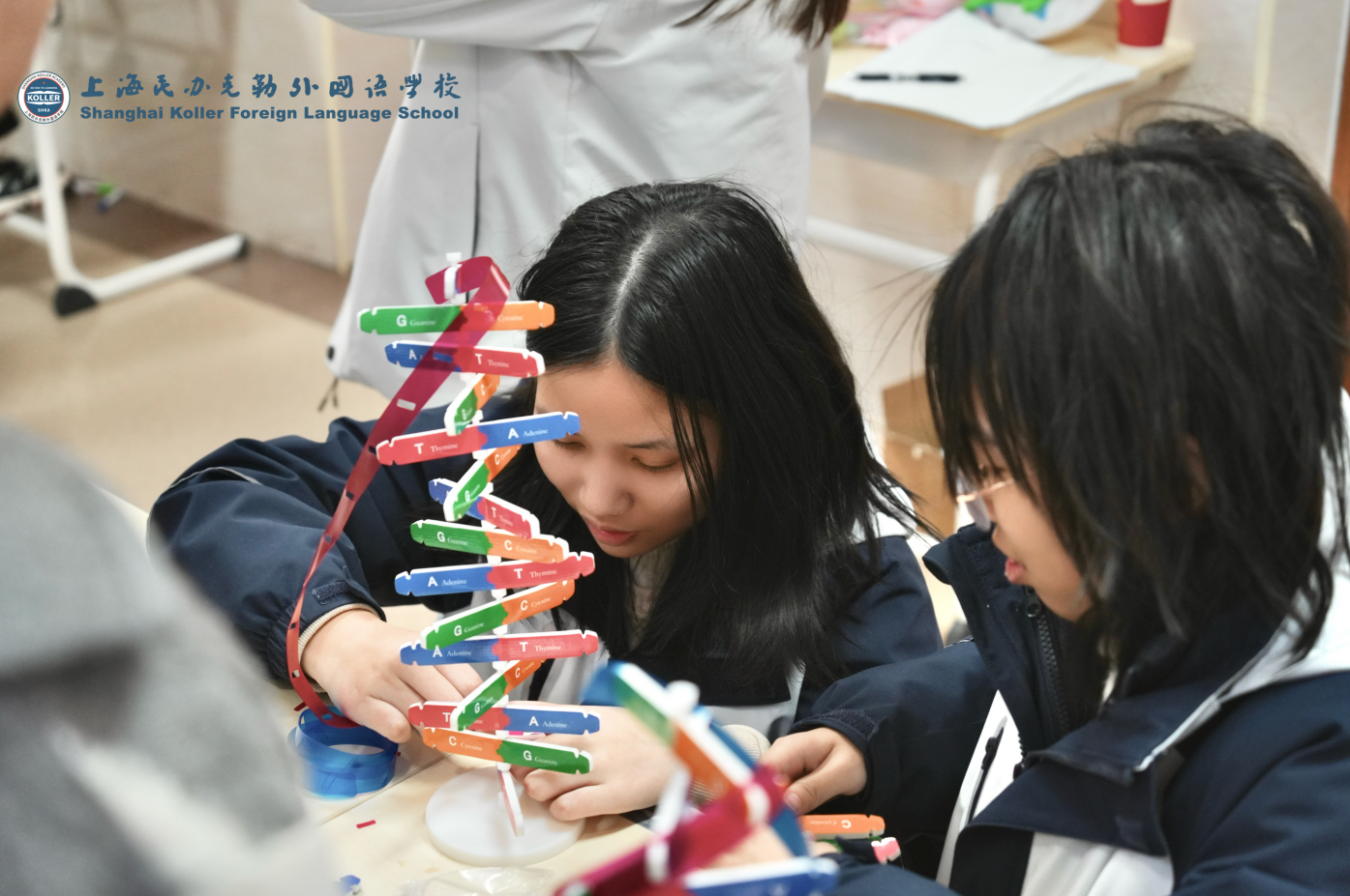 同学们在老师的指导下,借助一块块长条型的单词拼图,亲手搭建出立体的DNA双螺旋结构。在拼接的过程中,不仅直观还原了生命“密码”的形态,更在动手实践中记忆相关科学词汇、理解DNA的结构特点。