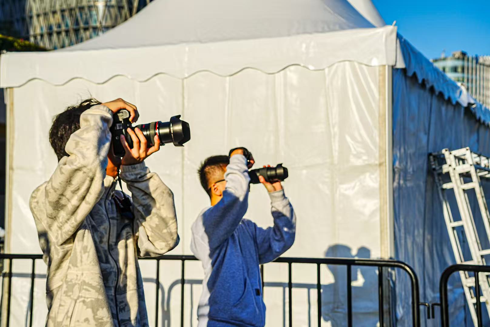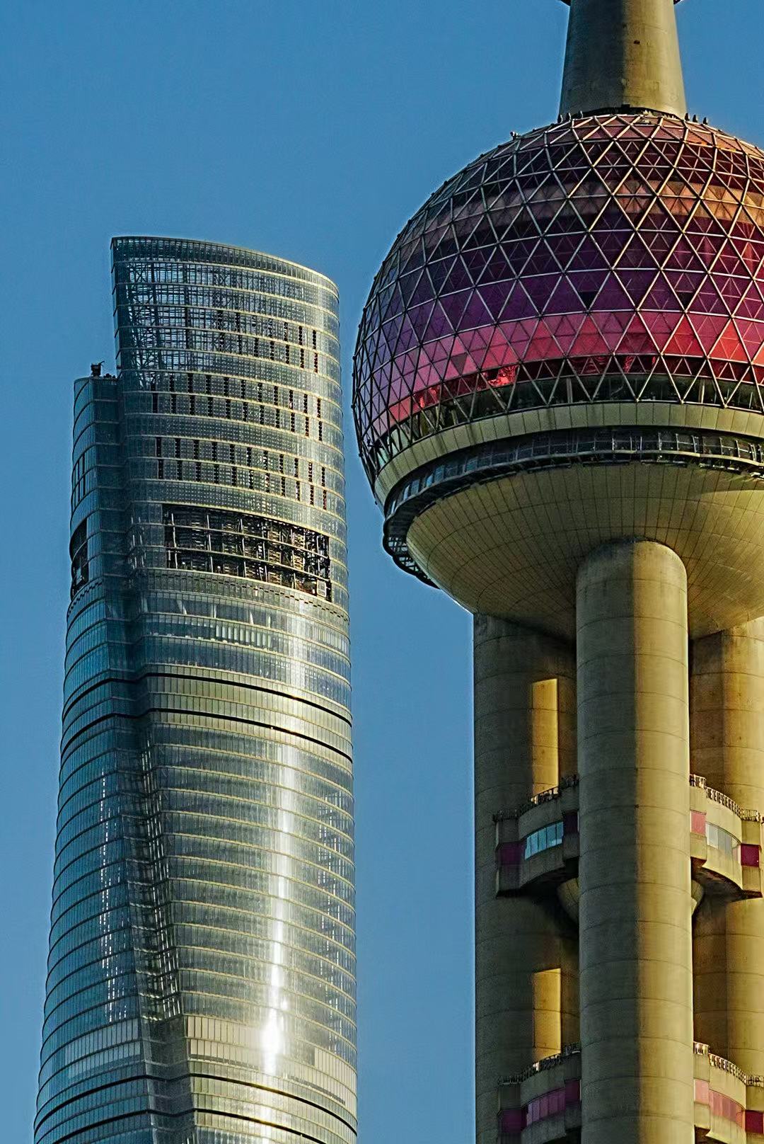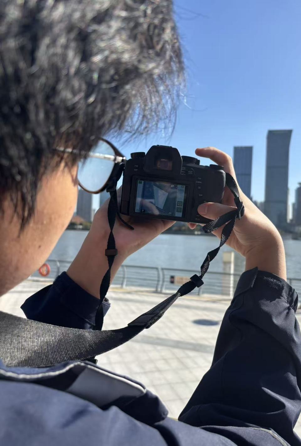 拍摄当天,天公作美,晴空万里。六位同学与我一同前往北外滩滨江,沿着黄浦江北岸一路向西,将陆家嘴金融区的摩天大楼、“三件套”的挺拔身姿,一一收入镜头。